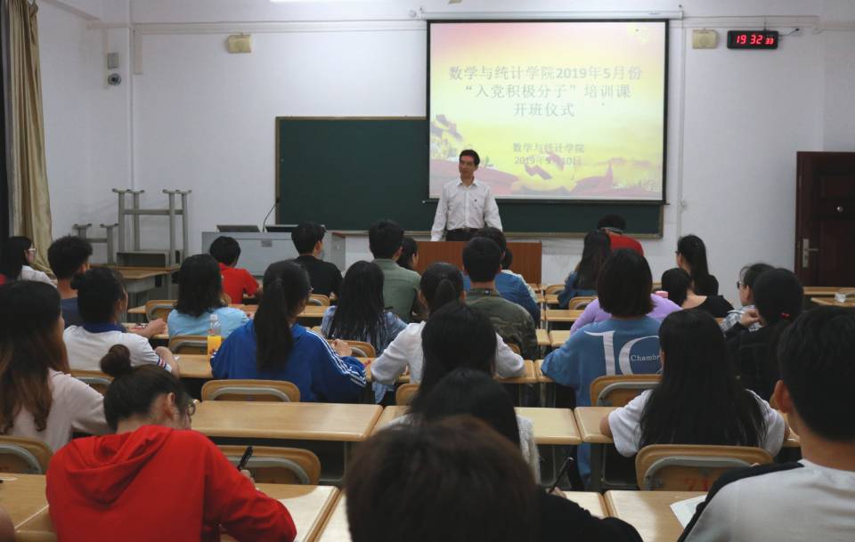 为帮助广大入党积极分子深入学习习近平新时代中国特色社会主义思想,系统了解党的基本知识,准确把握党的基本理论、基本路线、方针、政策,端正入党动机,提高政治思想觉悟,数学与统计学院2019年上半年入党积极分子培训班于5月10日晚在西区格致楼708教室顺利开班。公司党总支部书记黄星寿、团委书记罗曼及66名入党积极分子参加此次开班仪式。