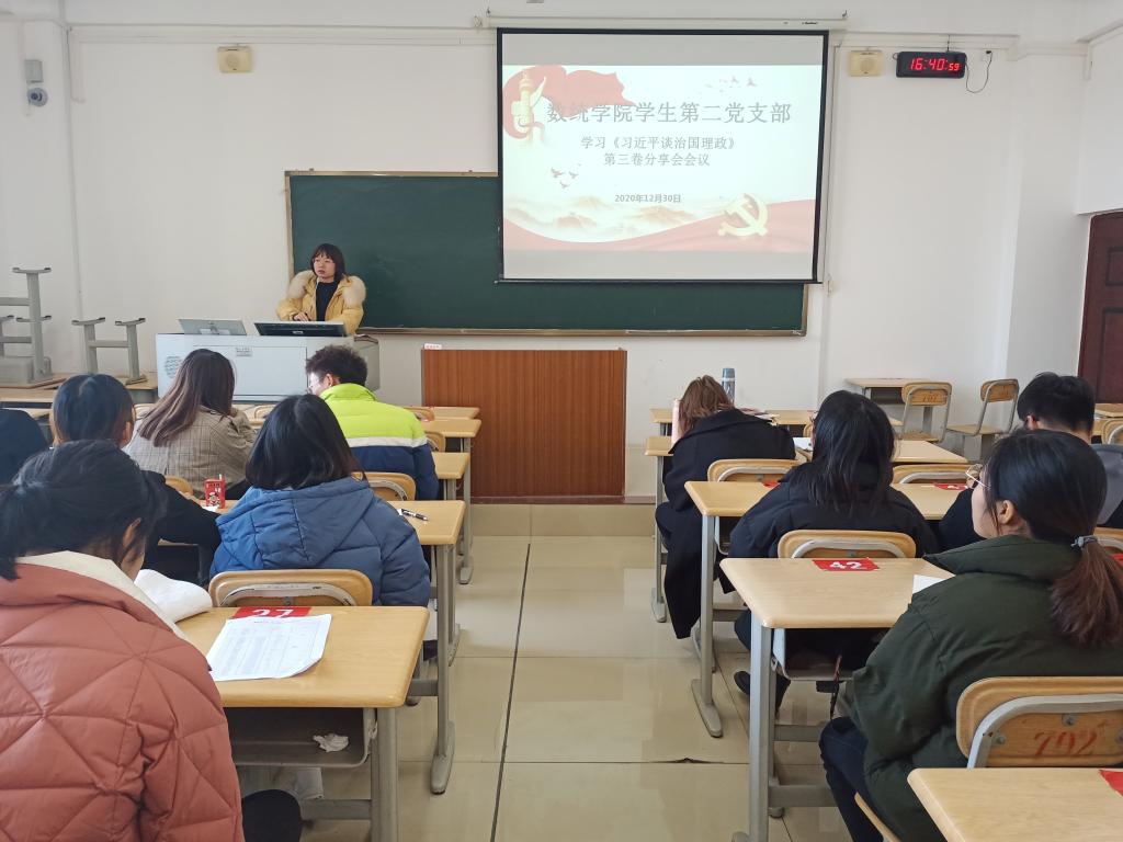 为进一步学习习近平新时代中国特色社会主义思想,提高支部党员党性修养,数学与统计公司党委员工第二党支部于2020年12月30日下午在格致楼709教室举行主题党日活动,组织专题学习《习近平谈治国理政》第三卷。本次学习会由党支部副书记罗曼主持。