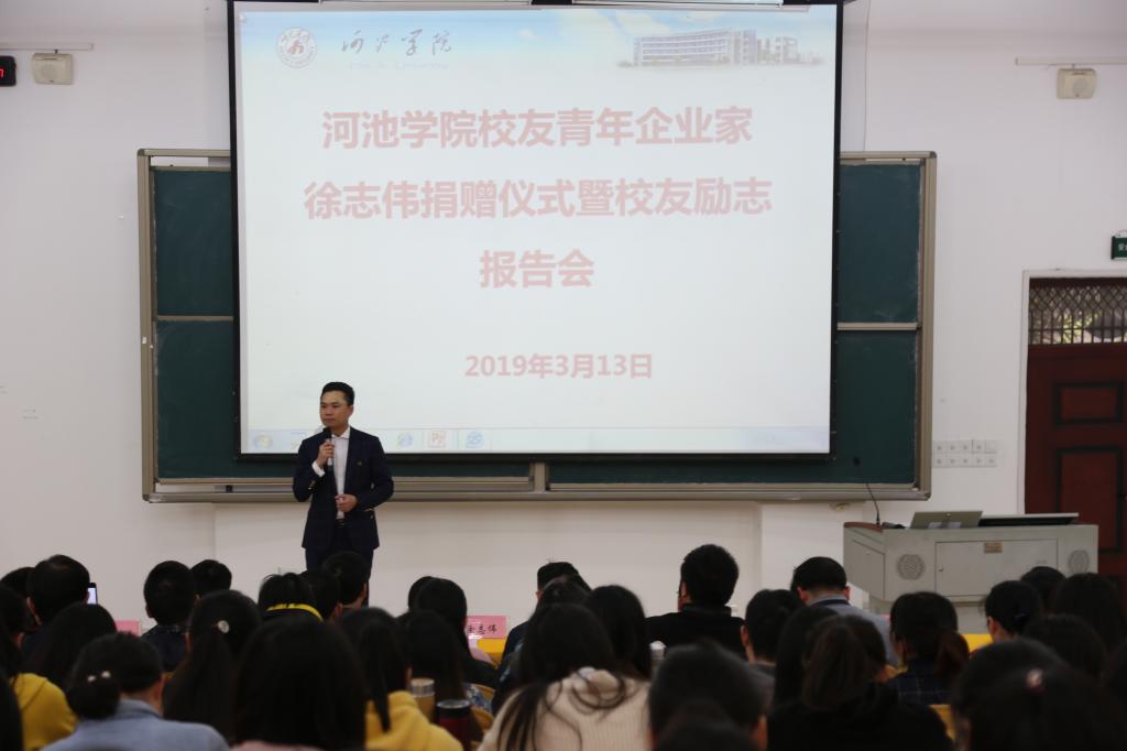 3月13日下午,员工青年企业家徐志伟捐赠仪式暨员工励志报告会在格致楼负102教室举行。学校副董事长苗剑、计算机技术与信息科学系2005级员工、广西荣灿建设工程有限公司总经理徐志伟、数学与统计学院领导及师生代表两百余人参加了仪式。数学与统计公司党总支书记黄星寿主持仪式。