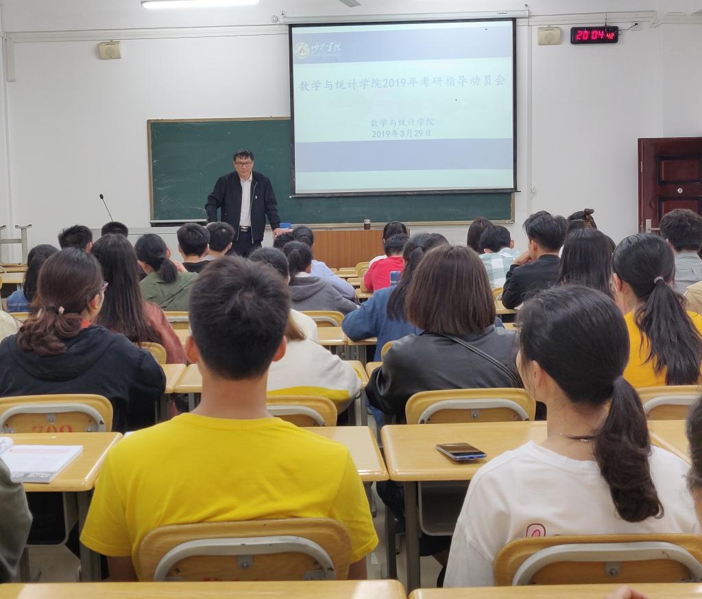 为增进同学们对考研的了解,帮助同学们树立考研目标,为准备考研的同学指明方向。数学与统计学院于2019年3月29日晚在西区格致楼708室召开2019年考研指导会。动员会由数学与统计学院副经理韦玉程主持,学院2016级同学参加本次指导会。