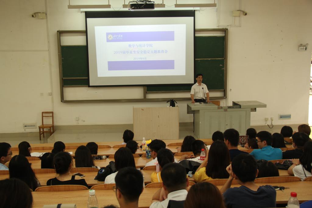 6月3日下午,数学与统计学院于弘毅楼1-102教室召开了2019届毕业生安全教育大会。党院总支书记黄星寿、经理罗日才、辅导员姚宁及2019届全体毕业生参加了会议。会议由学院团委书记罗曼主持。