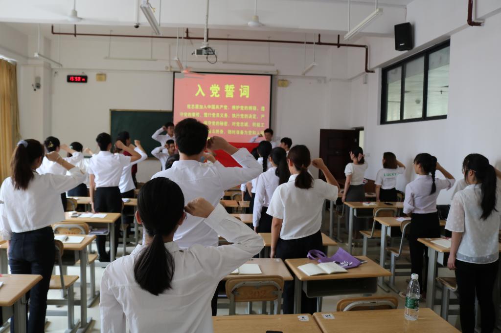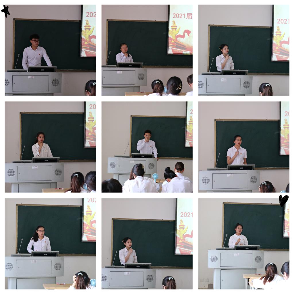 会上,张明进领读入党誓词,全体毕业生党员郑重的在鲜红的党旗下庄严宣誓,坚守入党初心,牢记党员承诺,再次接受了心灵的净化和洗礼。与会党员同志一同观看了建党百年主题系列微视频《这百年》,循着历史时间线,回望百年奋斗历程,展望未来光明前景。随后,与会领导与党员们进行了“党员谈初心”的主题交流环节,毕业生党员依次上台畅所欲言,就入党前、后心路历程以及入党后自身在思想意识、学习工作态度等方面发生的积极改变,深入剖析、畅谈入党初心。他们表示,再过几天我们将迎来伟大党的百年华诞,作为一名毕业生党员,我们会牢记入党初心,在新的奋斗征程中将不负人民重托,不辱时代使命,充分发挥党员的模范带头作用,积极工作,感恩母校,回报社会。罗曼为同学们讲解毕业生党员组织关系及其转移程序的注意事项。在庆祝中国共产党成立100周年之际,黄星寿嘱咐同学们要在今后的工作学习中铭记党员身份,不断学习党史,从党史中汲取砥砺前行的力量,在学史明理、学史增信、学史崇德、学史力行中行稳致远,做到学党史、悟思想、办实事、开新局,争做一名优秀的共产党员。同时,他向毕业生党员们送上了诚挚的祝福,希望同学们秉承“修德 弘毅 勤业 致远”的校训,脚踏实地,敢于担当,永保共产党员先进性,在新的岗位上继续谱写属于自己的壮丽篇章。
