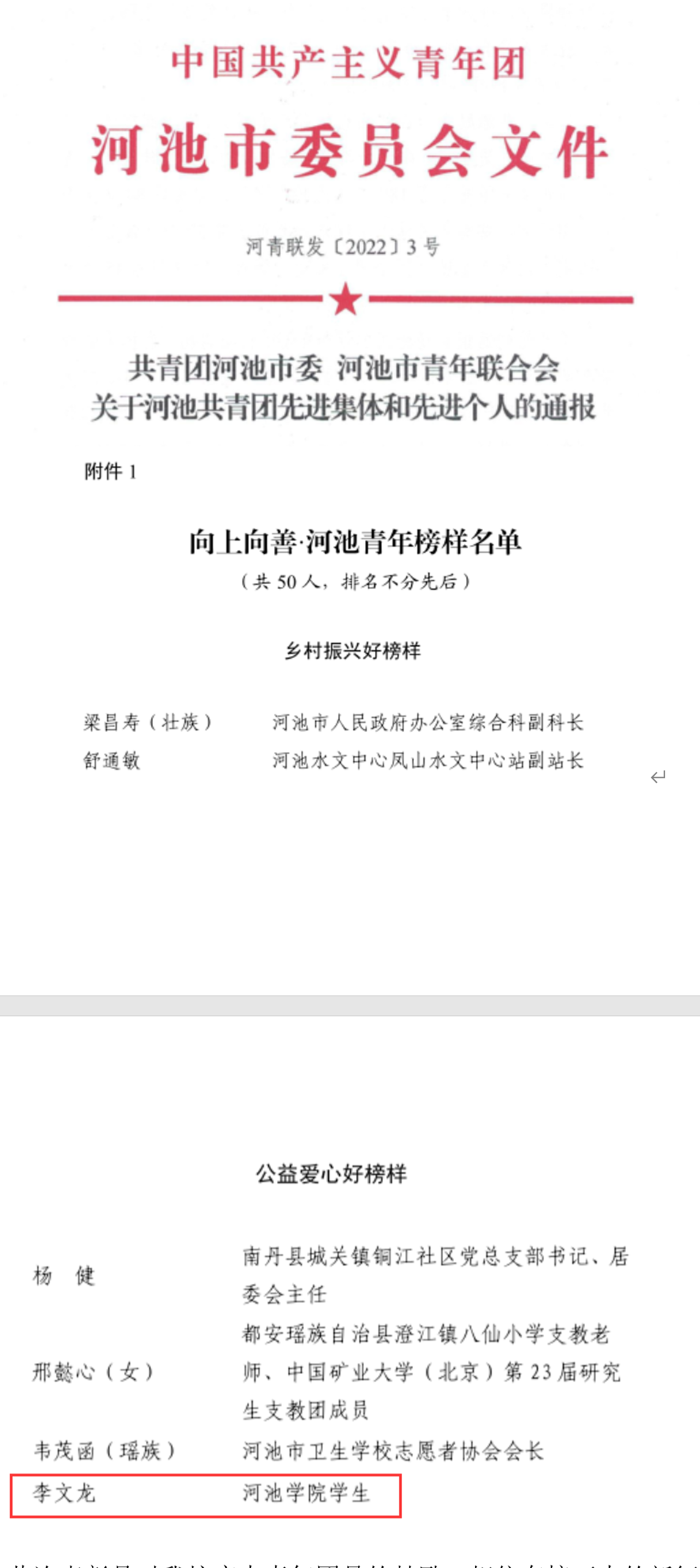 近日,河青联发[2022]3号文根据共青团河池市委下发的 《共青团河池市委河池市青年联合会关于河池共青团先进集体和先进个人的通报》(河青联发[2022]3号)文件获悉,太阳成tyc7111cc2019级经济统计专业李文龙同学荣获“向上向善河池青年榜样”中公益爱心好榜样荣誉称号。