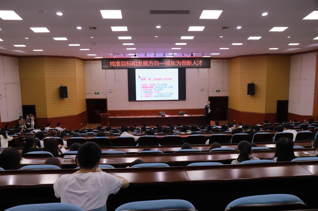 讲座中,高英俊教授简析了树立目标与方向的重要性,介绍了国家、自治区各层次人才培养计划、要求,向同学们展示了国家、学校、学院营造的有利于拔尖创新人才脱颖而出的良好环境。在成为创新人才方面,高教授也给出四大“锦囊”:第一,针对目标,打好基础;第二,寻找优秀导师,给予精准指导;第三,要成功需具备“五颗心”——信心、恒心、用心、专心和细心;第四,目标的实现要踏实做人、做事。高教授鼓励本科生继续深造,上大舞台、入主战场、成大事业。希望同学们要具备扎实的专业基础,卓越的创新能力,放眼于更广阔的视野,走到祖国需要的地方,服务国家战略和人类社会的进步,成长为德智体美劳全面发展、具有竞争力的拔尖创新人才。