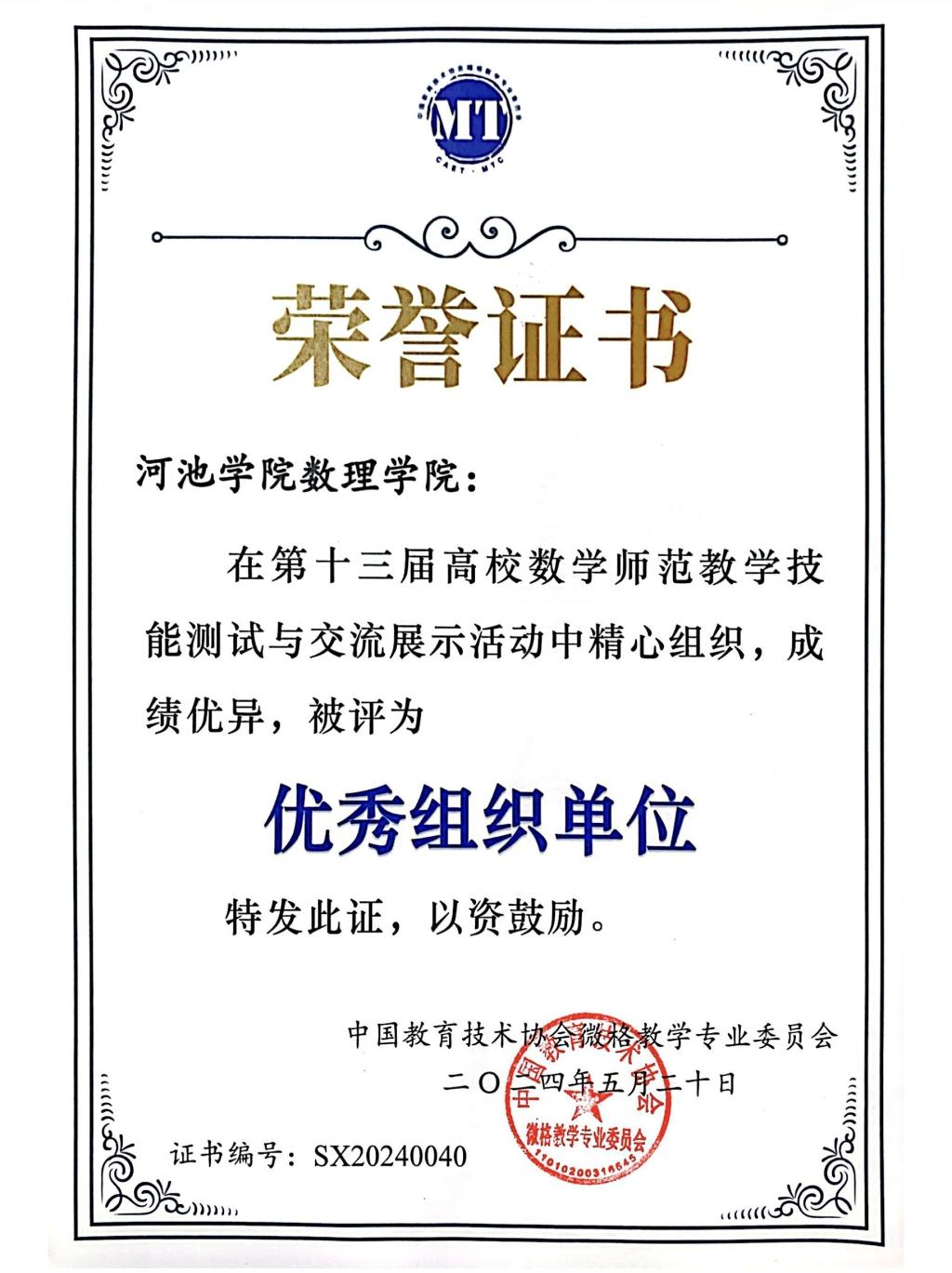 5月18日至5月20日,由中国教育技术协会微格教学专业委员会主办,2024年数学微格教学论坛暨第十三届高校数学师范生教学技能测试与交流展示活动在广西师范大学育才校区举行。本次活动由肖春梅教授带队,在“数学微格教学技能测试”中,公司参赛选手廖心雨、陈小丽荣获二等奖,林雪婷、万绮雯荣获三等奖,太阳成tyc7111cc荣获优秀组织单位。
