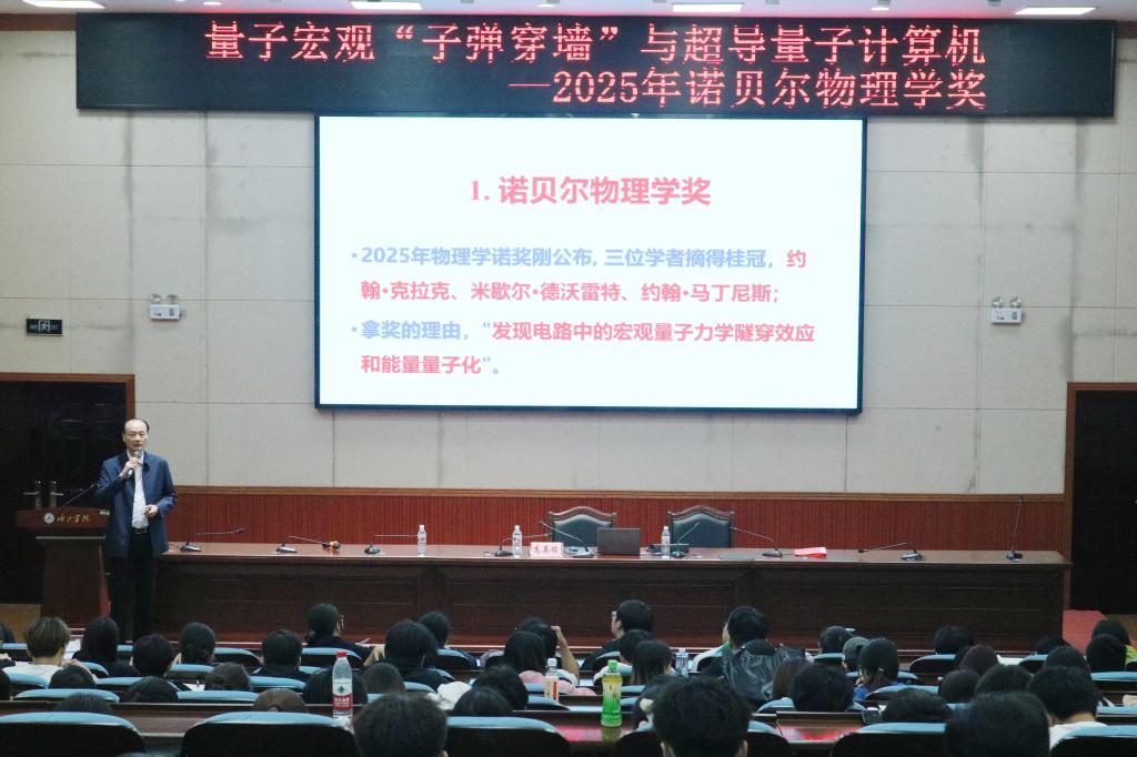 讲座开始,高教授以2025年诺贝尔物理学奖为切入点,明确该奖项授予约翰・克拉克、米歇尔・德沃雷特、约翰・马丁尼斯三位学者,表彰其“发现电路中的宏观量子力学隧穿效应和能量量子化”的突破,并号召同学们向几位科学家学习这种坚持不懈的钻研精神,也为后续讲解铺垫理论背景。他用“小球穿墙”的通俗类比,对比经典物理与量子物理的差异,生动阐释“量子隧穿”的特殊性,让师生理解超导隧穿的理论根基。