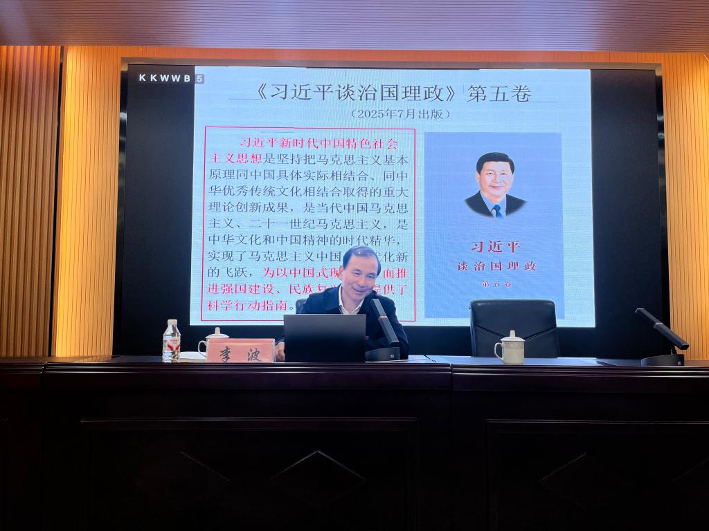 李波教授重点围绕“两个结合”的理论创新、“十个明确”的核心要义、“十四个坚持”基本方略,以及党的十八大以来取得的“十三个方面成就”进行了深入解析。尤其重点解读了“六个必须坚持”这一习近平新时代中国特色社会主义思想的世界观和方法论,鼓励师生将这一科学思想方法融入课程思政、科研攻关与学术实践,以理论指导实践、以实践深化认识。