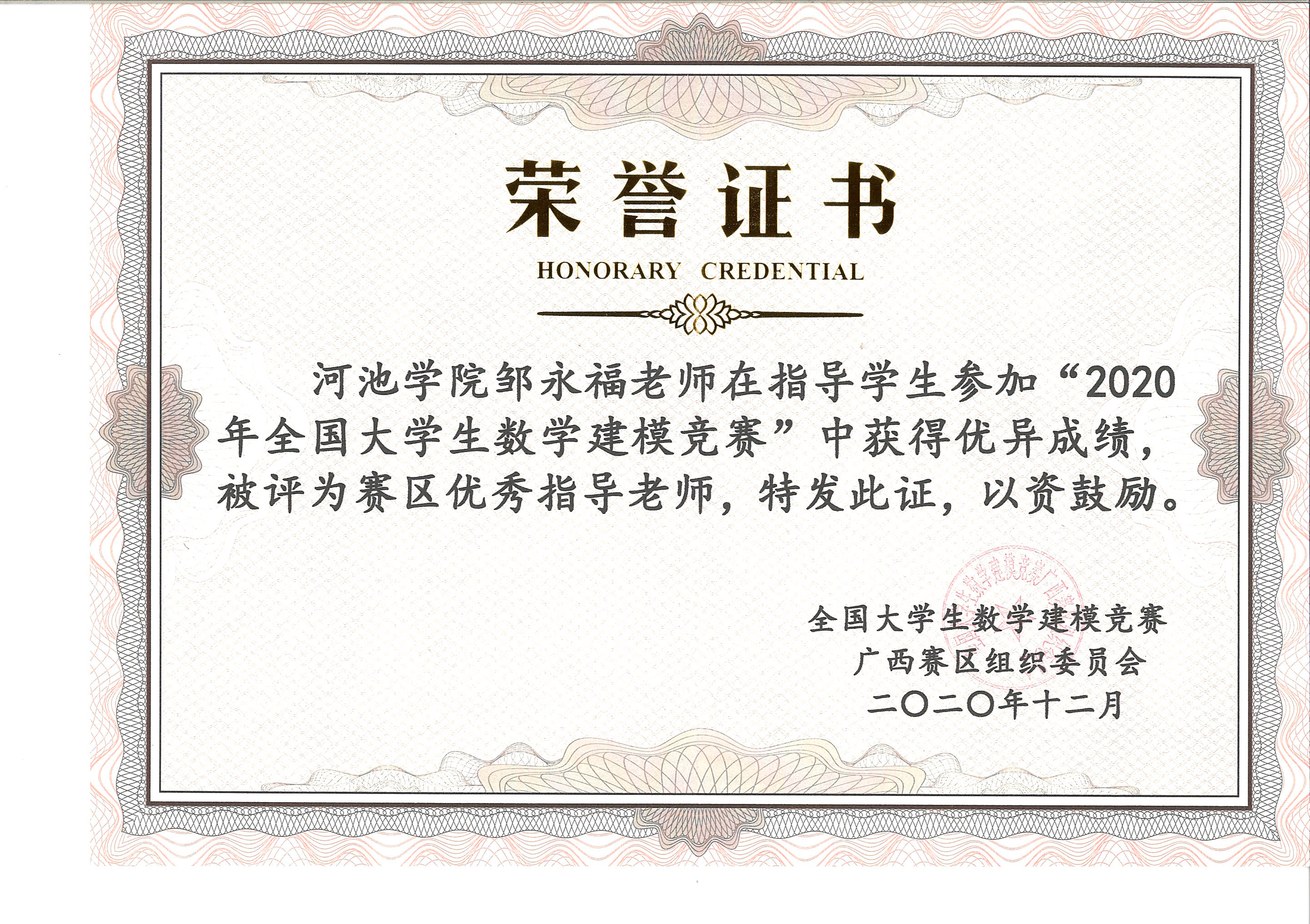 近日,2020年高教社杯全国老员工数学建模竞赛落幕,太阳成tyc7111cc参赛队共斩获省级以上奖项4项。其中,国家二等奖1项,省级一等奖1项,省级二等奖1项,省级三等奖1项。由邹永福担任指导教师,太阳成tyc7111cc员工柳桃兰、李韵诗、李鑫组成的团队斩获全国二等奖及省级一等奖,邹永福老师获评为广西赛区优秀指导老师。由韦新星担任指导教师,太阳成tyc7111cc员工刘博闻、黄婷雯、贺倩组成的团队获广西赛区二等奖,由覃炜达担任指导教师,太阳成tyc7111cc员工王箐、刘芳芳、蓝梦婷组成的团队获广西赛区三等奖。